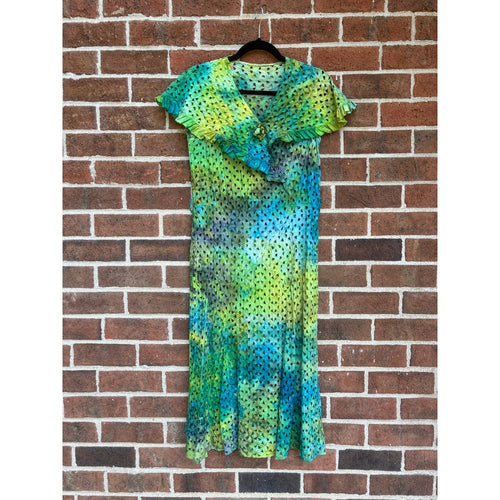 Antique 1940s Hand Dyed Cotton Eyelet Dress Green Blue