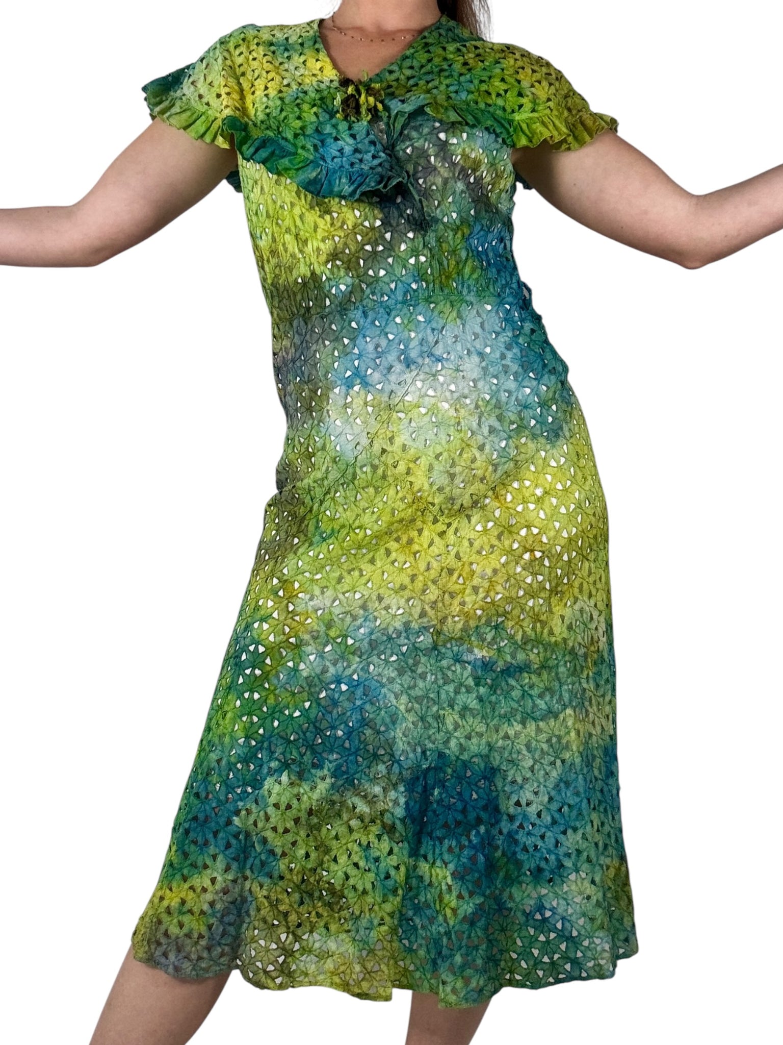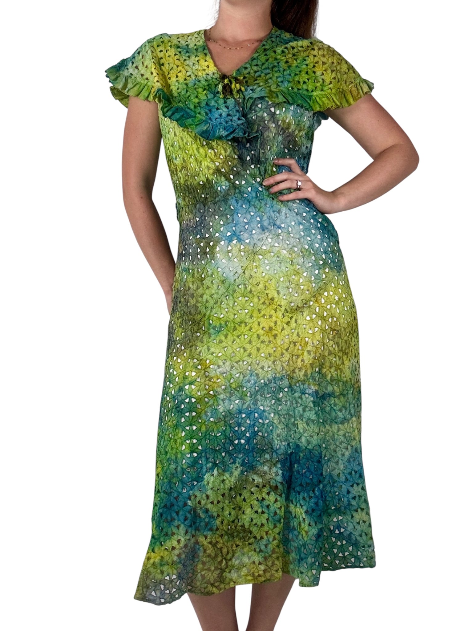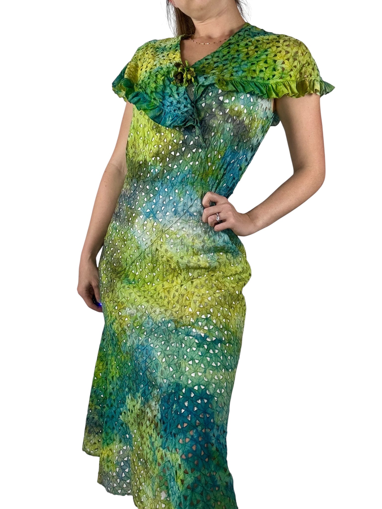 Expertly hand dyed antique 1940s cotton eyelet dress. This antique beauty has been given new life with permanent green and blue ice dye techniques. This lightweight dress is made from an eyelet cotton with ruffle trim and rosettes. There is a left side seam opening that closes with metal snaps. This dress is in good antique condition however a few repairs have been made through out the years. This dress should be delicately worn.