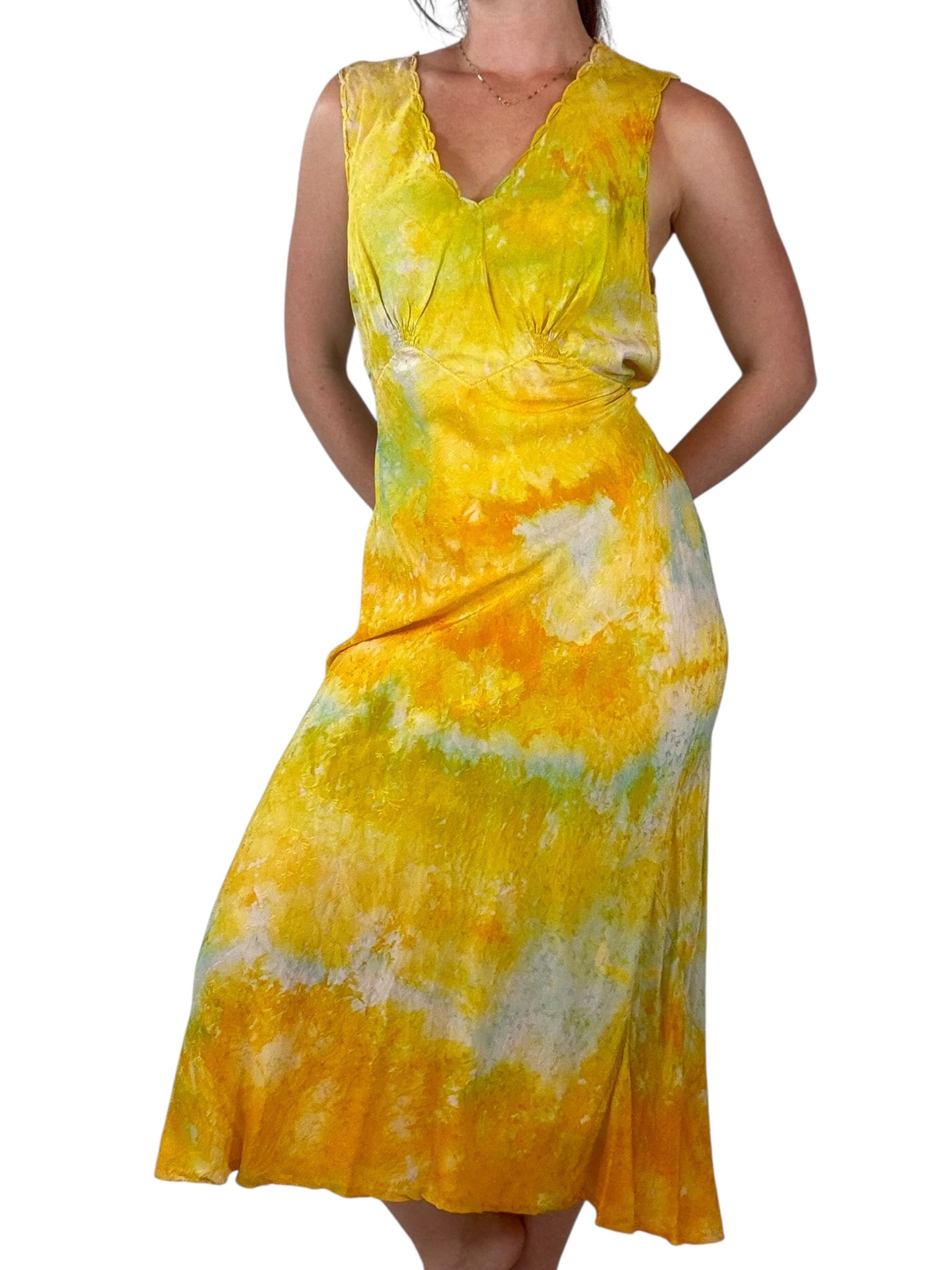 Expertly hand dyed antique slip dress or nightgown. This antique beauty has been expertly dyed with yellow and green to cover imperfections due to age. It is full length with scalloped edges along the neckline and arm holes. The original belt is included. The fabric has a floral jacquard design.