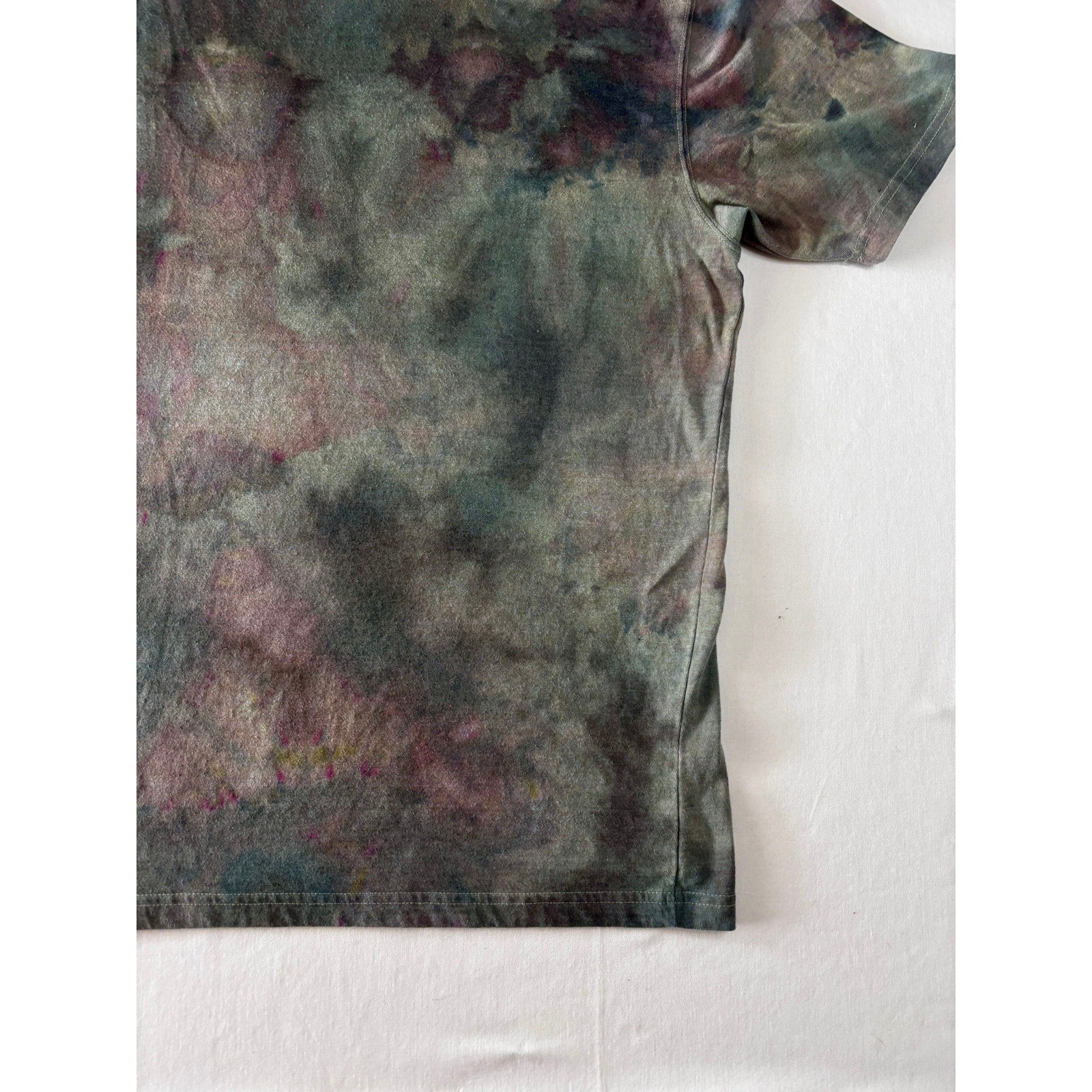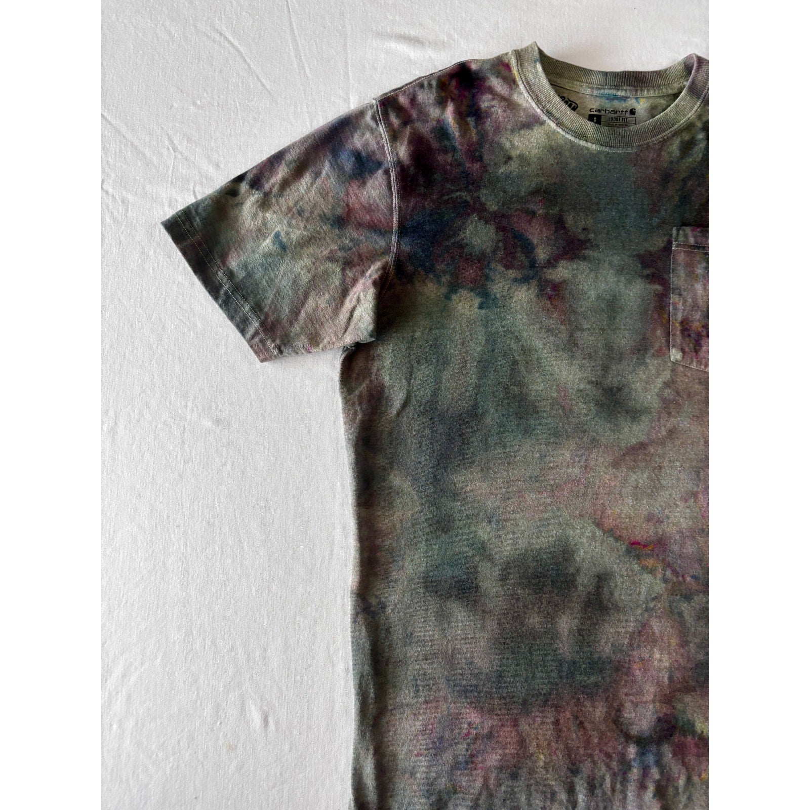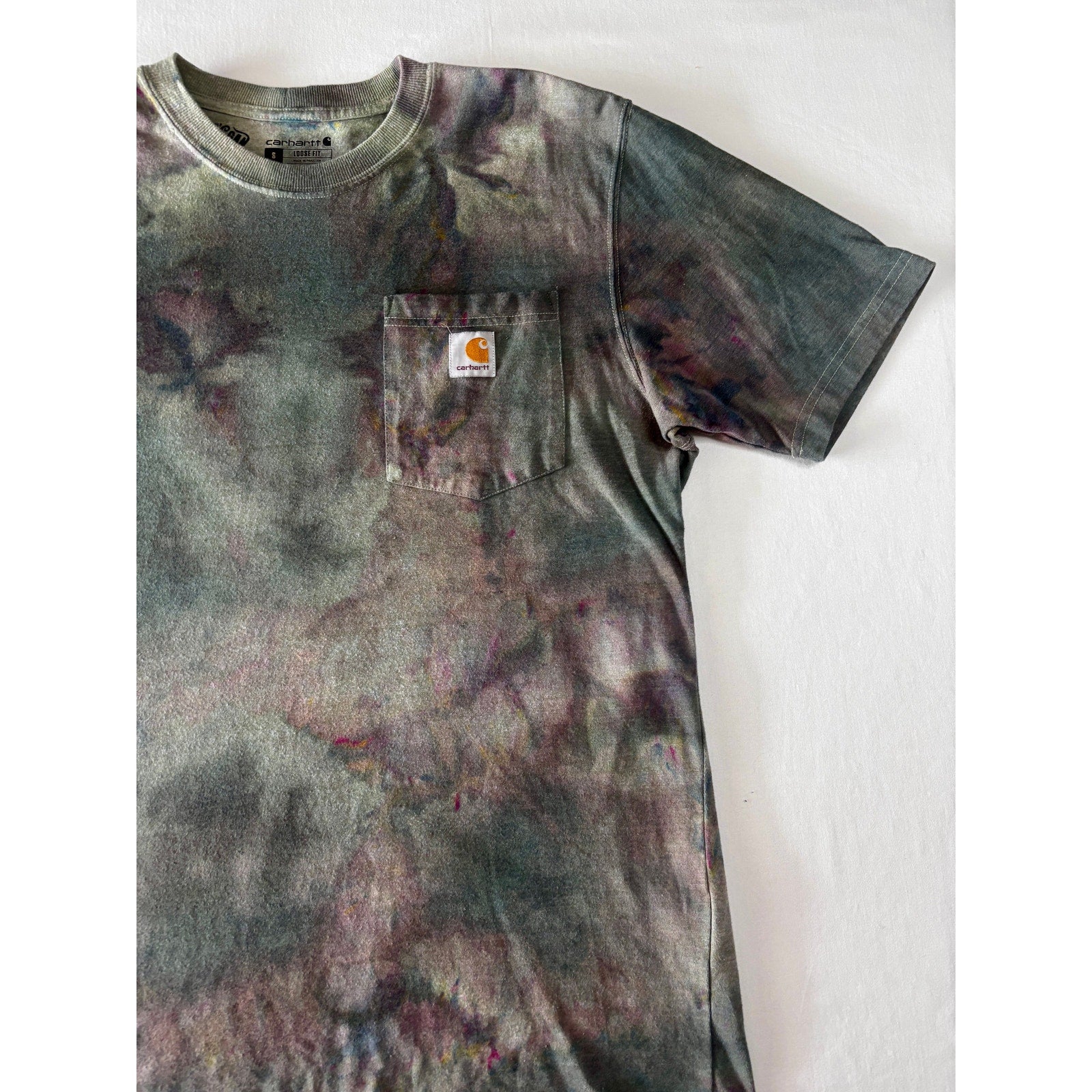 Ice dyed Carhartt t-shirt in purple and gray. Expert dye techniques have given this pre-loved shirt a one-of-a-kind new look.