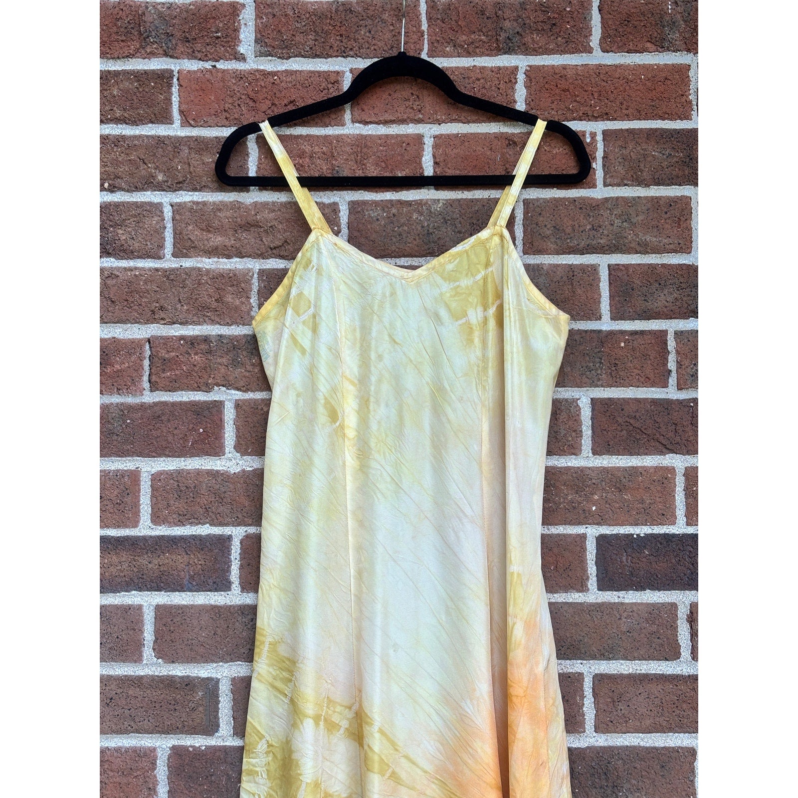 Expertly hand dyed antique slip dress or nightgown. This antique beauty has been expertly dyed with permanent ombre yellow and pink tie dying techniques. It is full length and made from an acetate fabric. It is in good condition considering its age with no major issues to note, but it should be delicately handled.